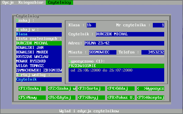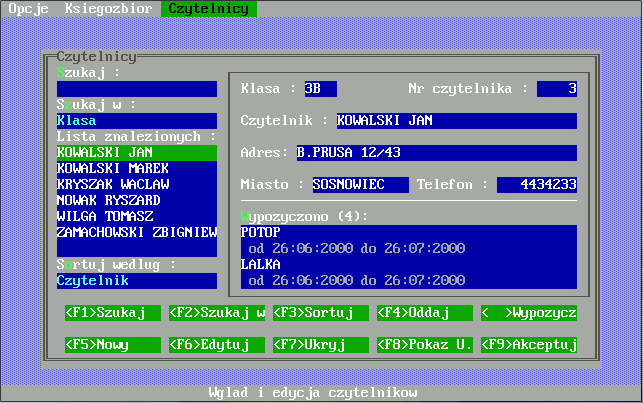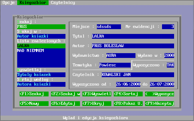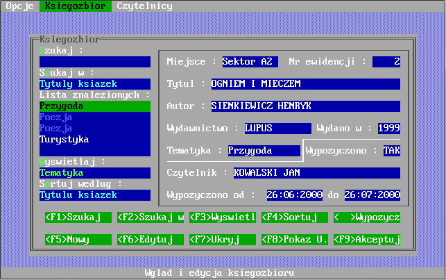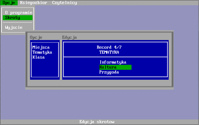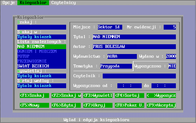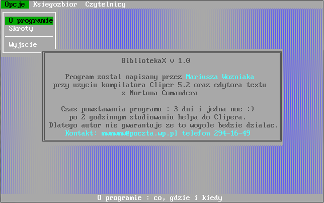 Program "Biblioteka" został napisany z myślą o kompleksowej obsłudze bibliotek szkolnych. Do jego stworzenia został wykorzystany język programowania Clipper 5.2 operujący na systemie zarządzania bazą danych dBase firmy Ashton-Tate. Aplikacja skierowana jest pod system operacyjny MS DOS, dlatego do poprawnego jej uruchomienia pod "okienkami" wymaga programu DOSBOX, który emuluje wyżej wymieniony systemu operacyjny. Program powstał w 2000 roku i jest prawdopodobnie najstarszym moim programem, który doczekał się powstania tej strony. Klasyk. ;)